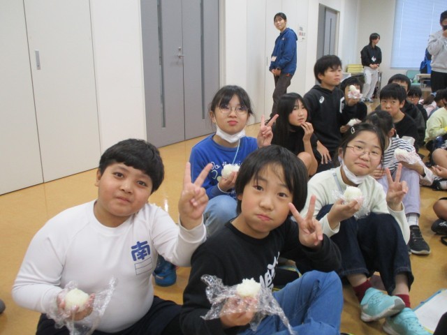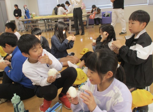 お米ができるまでの話を聞き、自分たちが育てたお米をおにぎりにしていただきました。
