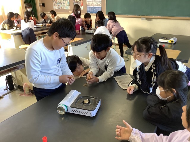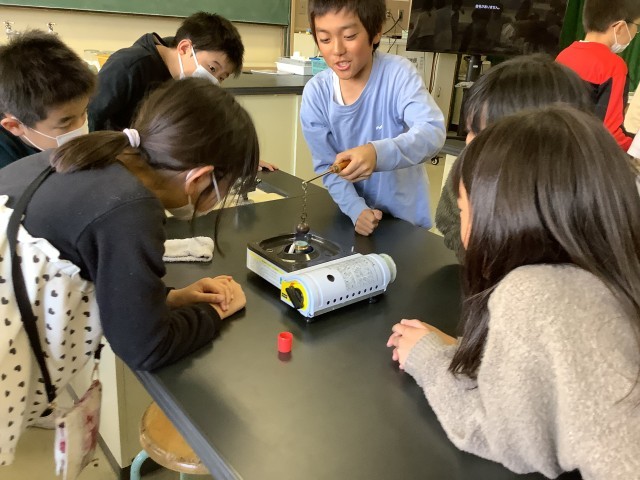理科の授業では、空気や水、金属をあたためたり冷やしたりしたら体積はどうなるか、実験でたしかめました。初めて使う実験器具に興味津々でありながら、正しい方法で取り扱おうと真剣な表情が印象的でした。最初は金属の輪に通らなかった玉が、熱することで輪を通った瞬間、子どもたちは驚きの表情や歓声をあげていました。
