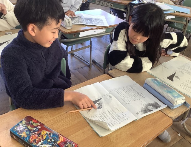 3組も「モチモチの木」の学習の様子です。「ふしぎなこと」とは何なのか、という先生の問いにぴんときていない子が多かったので、グループで話し合いの時間が設けられました。本文中の言葉を手掛かりに、根拠をもって友達に考えを伝えていました。どこからそう考えたのか指で示す姿から、わかりやすく伝えようという意欲を感じました。