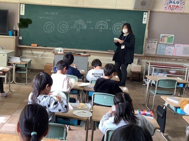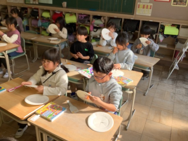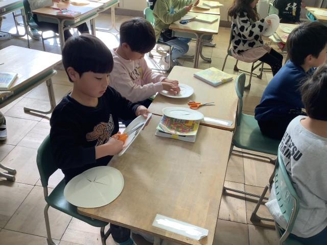 紙皿の中を切っていくのは難しかったけど、紙皿を折って切り込みを入れて、ていねいに切りました。