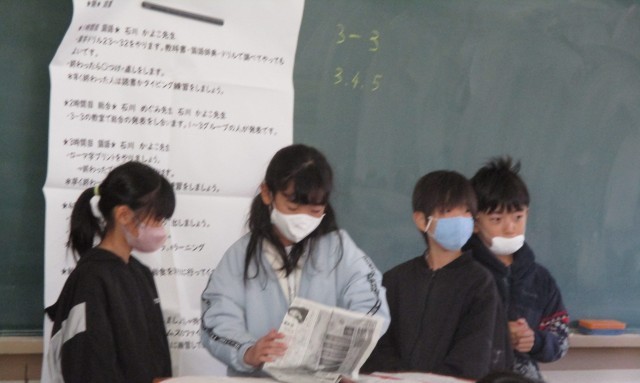 3組は防災の発表を1組に見せているところです。その場で新聞紙からスリッパを作ったり、避難所の一日を紙芝居で表現したりとどのグループも工夫を凝らしていました。1組の子は