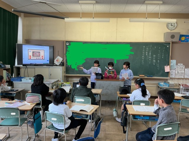 1組は国語「道具のうつりかわりを説明しよう」の発表の様子です。資料をテレビに提示し、