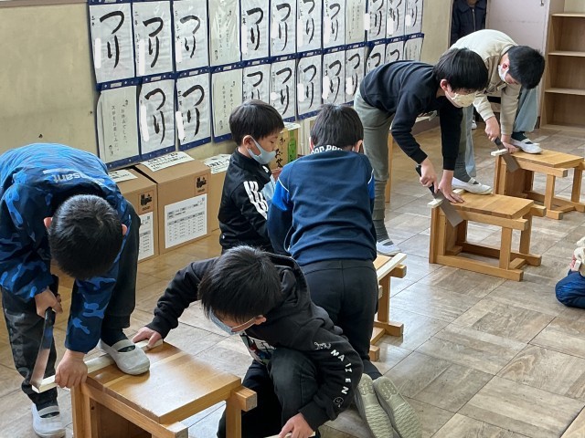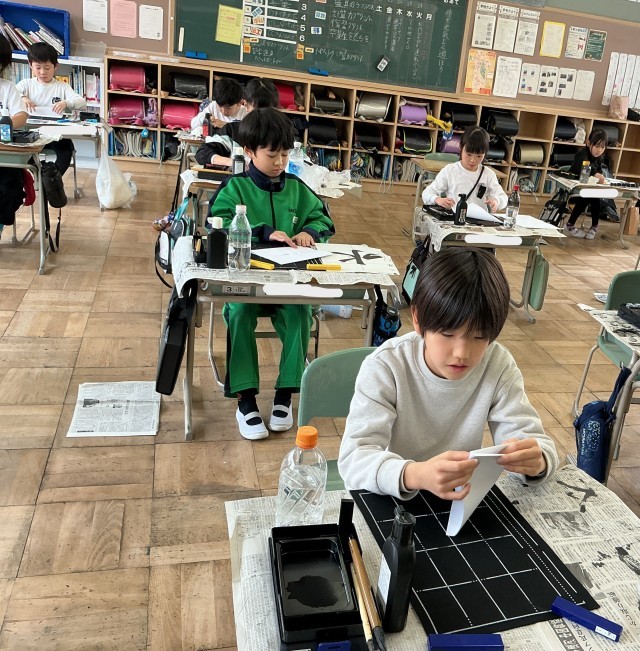 3組は、3年生最後の習字の時間です。みんな、とめ、はね、はらいに気を付け、一筆一筆に心を込めて書き上げました。この1年で、文字の書き方だけではなく、準備や片付けもとても上達しました。今回は、自分ですった墨も使いました。いつも使っている墨汁と同じ濃さにするのは大変でした。これもよい体験になったと思います。
