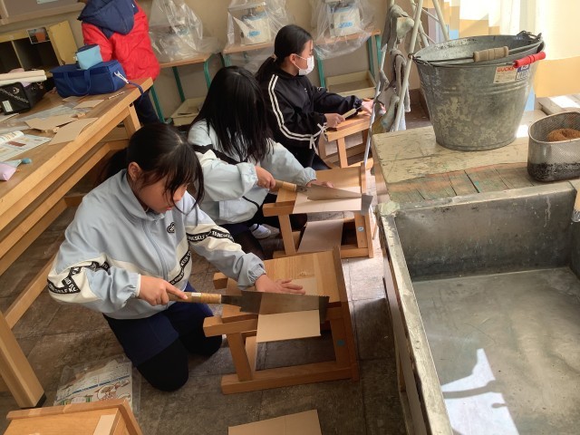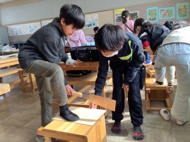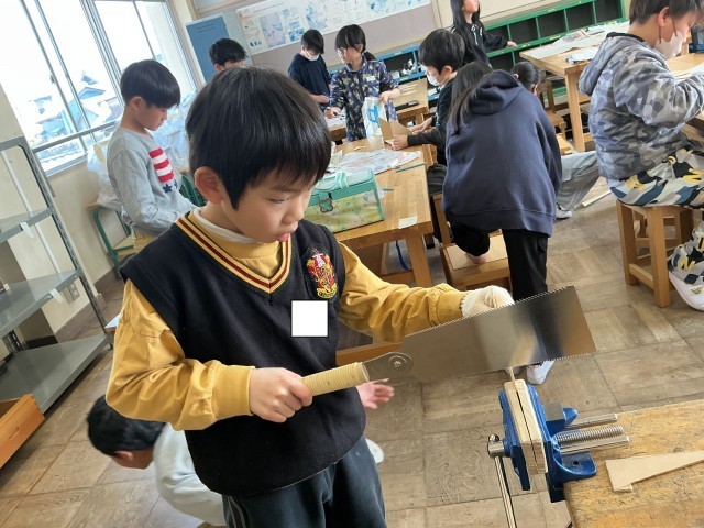 正しくのこぎりを使って、板を一生懸命切っています。