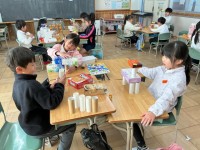 空き箱を集めていただき、ありがとうございました。子どもたちは、箱からイメージを膨らませ動物やロボットなどを作りました。作成後は、友達の作品で遊びながらお気に入りの作品を見つけ、楽しみながら鑑賞する姿が...