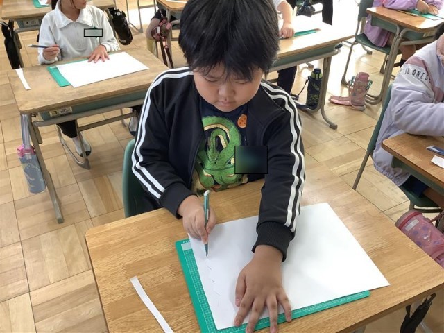 初めてカッターを使用して、紙を切りました。カッターの握り方を覚え、直線や曲線を慎重に切ることができました。