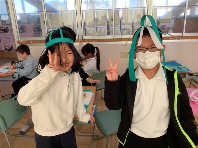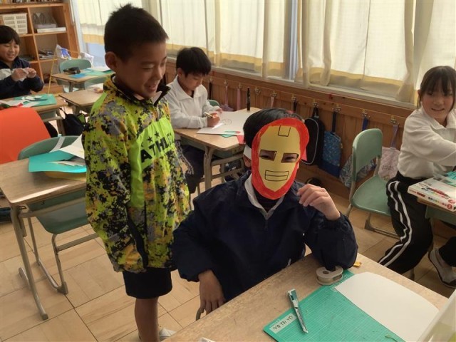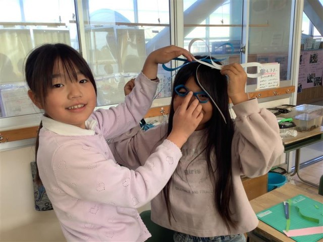 カッターを使って、線をたくさん切りました。その切ったもので、いろいろなものを作って遊びました。ファッションショーみたいになりました。