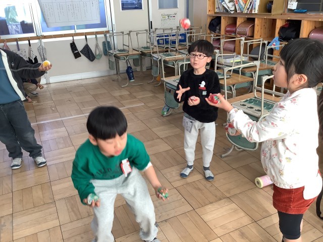 こま、けん玉、お手玉、ヨーヨーなどのむかしの遊びに触れました。