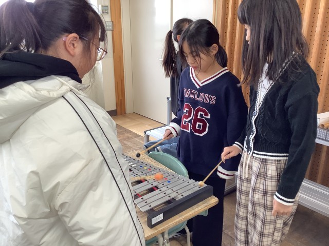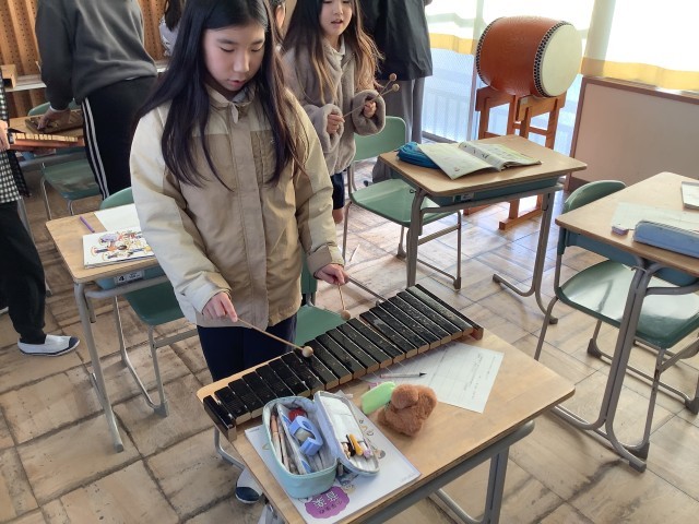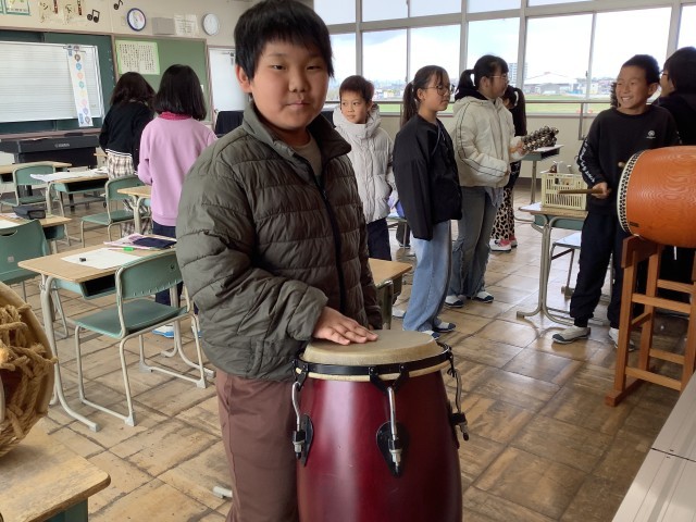 いろいろな打楽器を使って、音色の特徴や響きの長さを調べました。