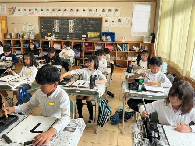 4年生はてきぱきと習字の準備を行い、筆の練習に取り組むことができました。