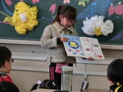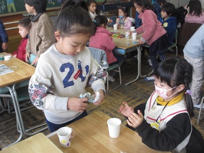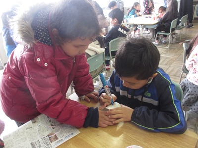 本校のオリジナル絵本「あははdeはっぴぃ〜♪」を読み聞かせたクラスもありました。また、1年生の子どもたちは、入学予定の子どもたちに、とても親切に剣玉の作り方を教えていました。