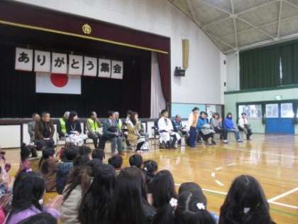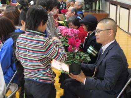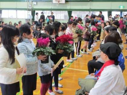 日頃からお世話になっている地域の方々や、学習の支援してくださった方へ感謝の気持ちを伝える「ありがとう集会」を開催しました。代表委員長からのお礼のことばの後、それぞれの方々へ、感謝の気持ちを綴った手紙と花鉢をプレゼントしました。代表として、古井町内会長からお話をいただき、子どもたちは改めて支えていただいていることへの感謝と喜びを感じたようです。会の最後は、感謝の気持ちを込め、全校で「ありがとうの花」を合唱しました。