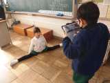 2年3組は、生活科の自分発見のまとめをしていました。二人組で、自分の姿をタブレットで撮ってもらいまとめに使っている子もいました。