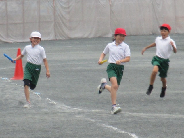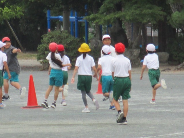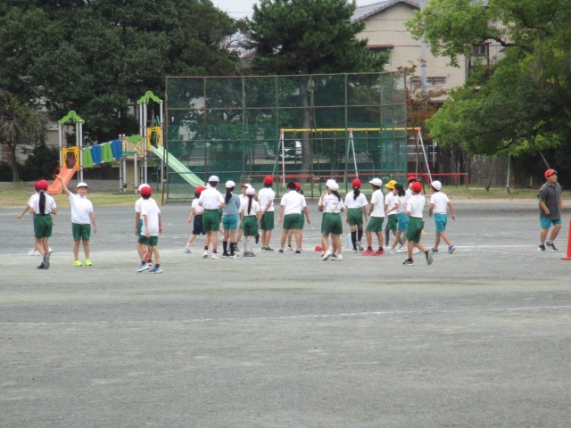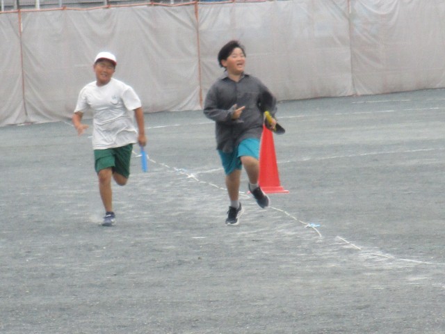 4年2組が運動場でリレーを行っていました。バトンが渡るときに大きな声で応援したり、チームの仲間の走りに励ましの声をかけたりして心を一つに頑張っていました。