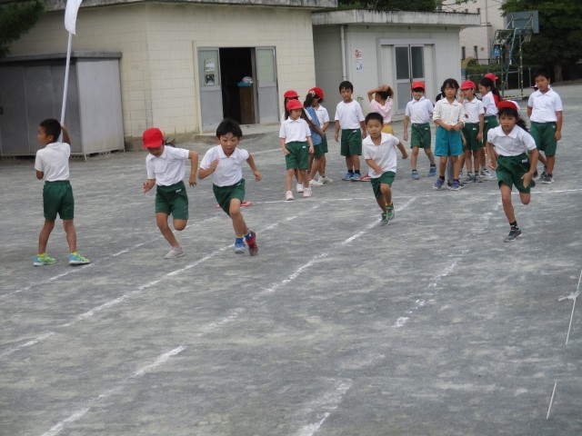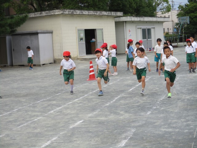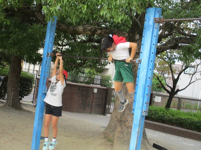 2年2組が運動場で鉄棒をしていました。できるようになった技を見せてくれました。その後、集合し、4列に分かれて走っていました。