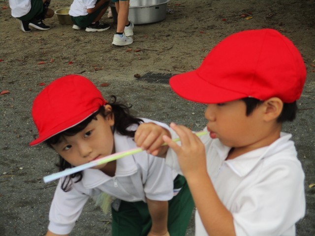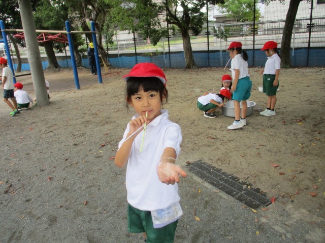 1年3組が、運動場でシャボン玉づくりに挑戦していました。思い思いの道具を使って大きなシャボン玉を作ったりたくさんのシャボン玉を作ったりして楽しく活動をしていました。