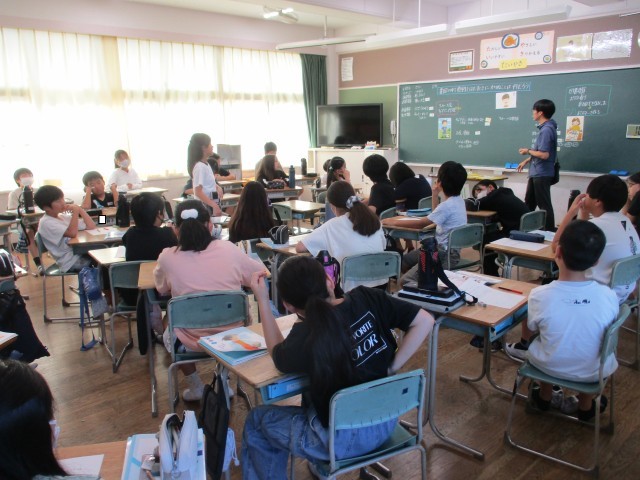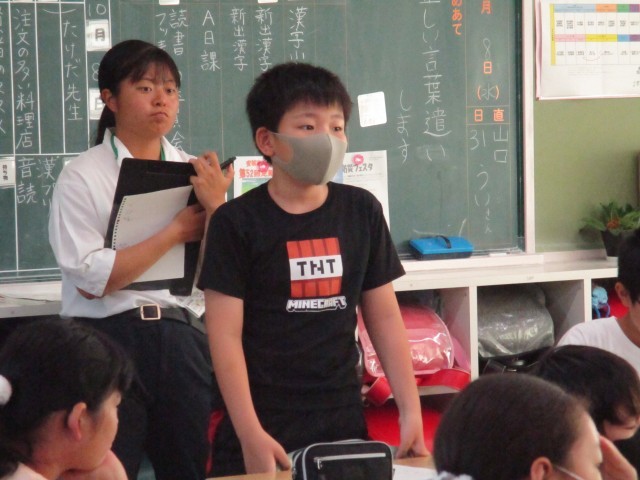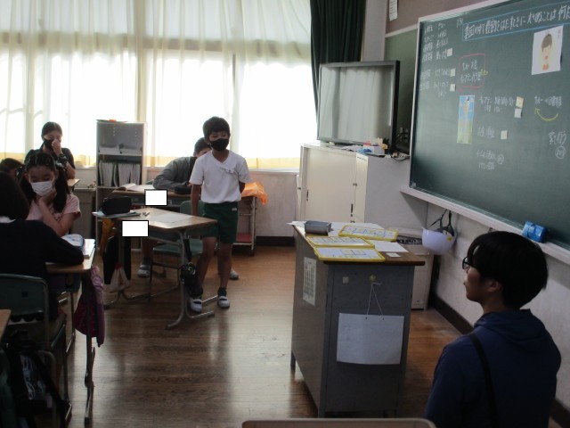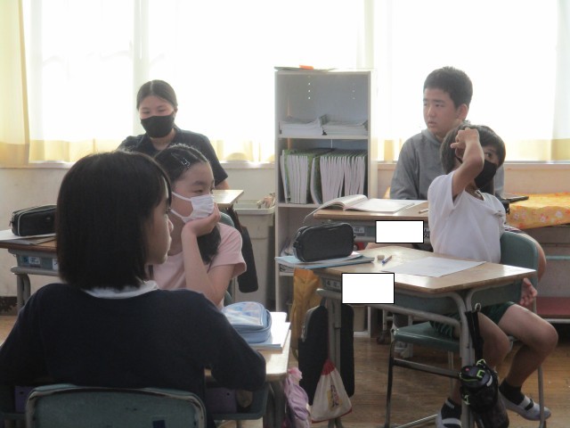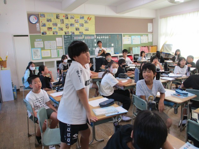 5年2組では、「集団の中で役割を果たす」ことについて話し合っていました。机を円にして顔を見ながら、主人公がサッカーか図書委員の仕事かどちらに参加したらよいのか考えながら考えを伝え合ってていました。
