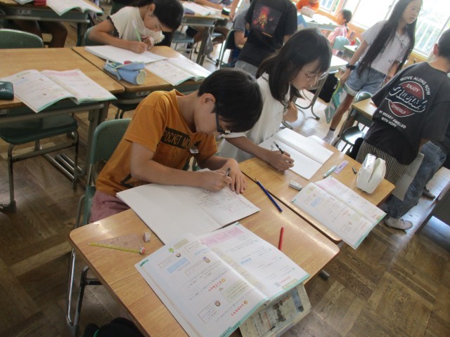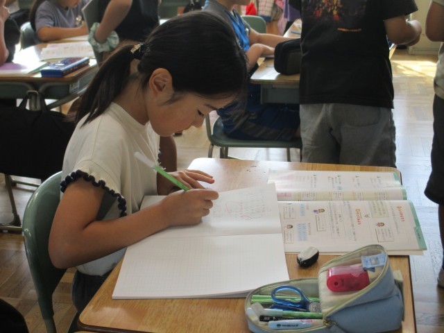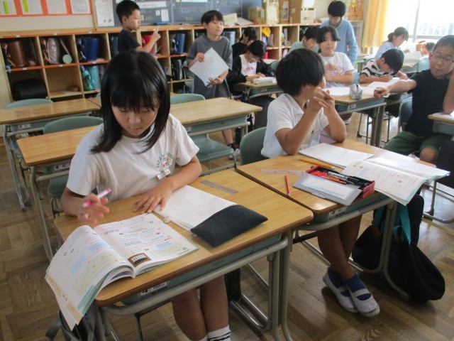 4年4組では、算数の「計算の順序」の最後のまとめで問題集に取り組んでいました。みんな学んだことを確かめるように問題を解いていました。