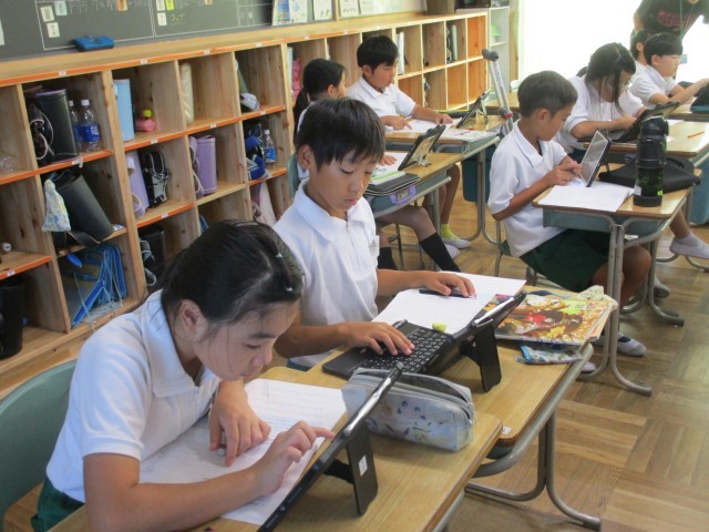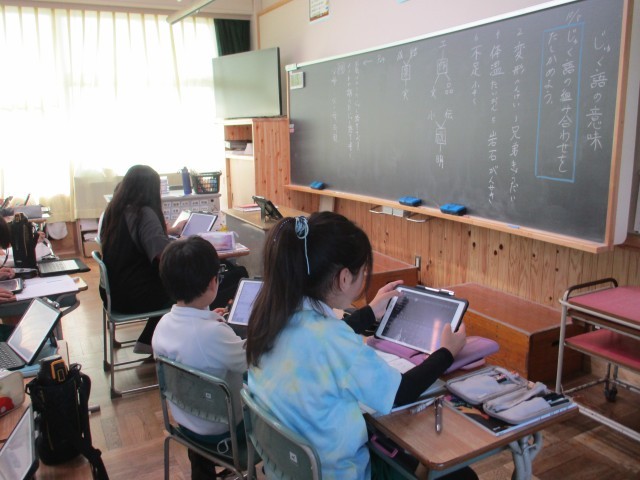 4年3組では、熟語の学習をしていました。熟語の意味をタブレットで調べて、問題集に書き込んでいました。