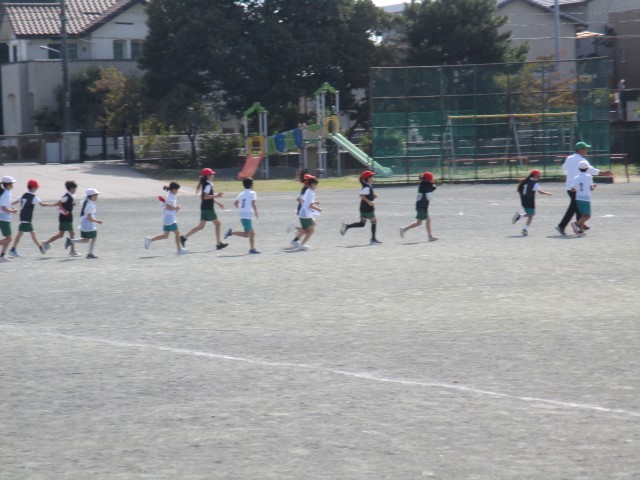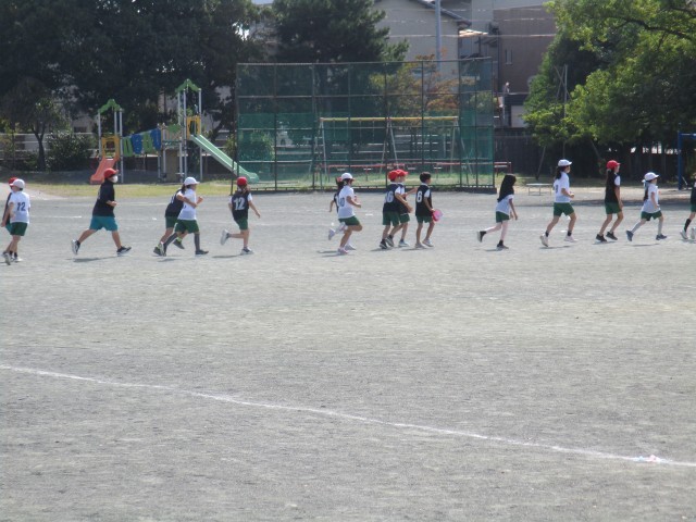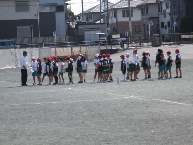 4年2組が、運動場でリレーの学習を行っていました。もうすぐ運動会の練習が始まるので、教師の後について退場の確認をしていました。