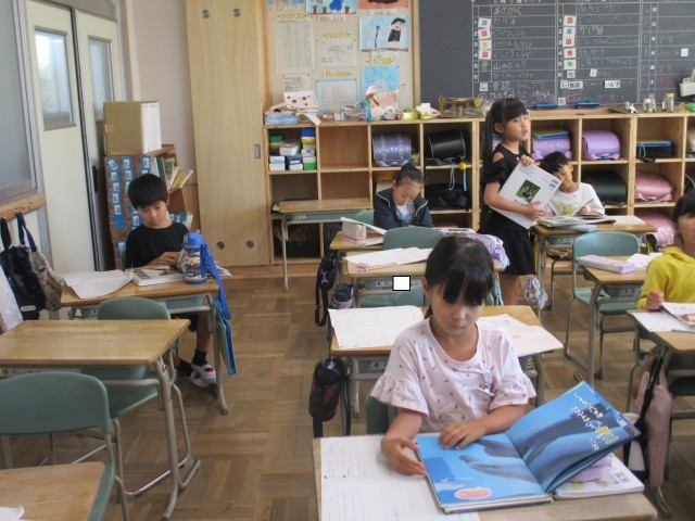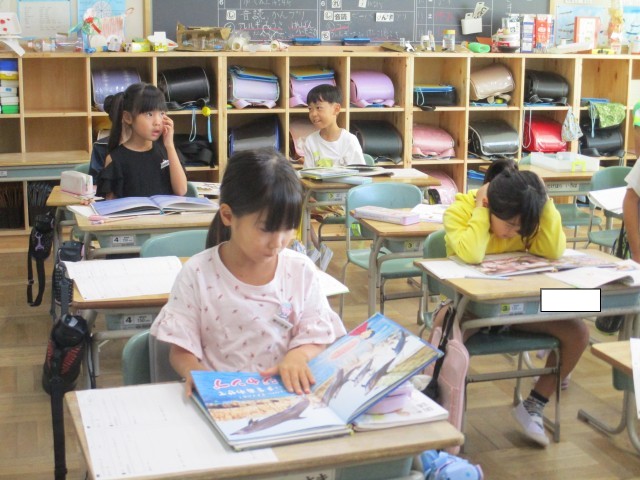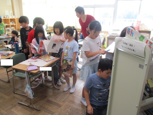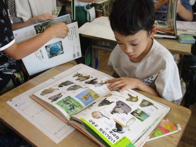 2年1組では、学校司書に本の索引の使い方を学びました。その後、動物のことを本で調べて動物カードを作っていました。本を選んだり本を読んだりする子どもたちの顔はとてもうれしそうでした。