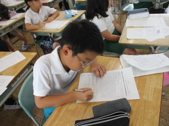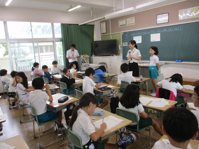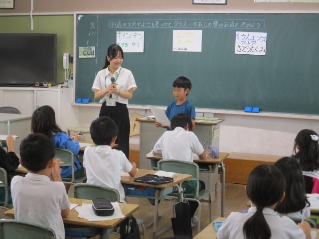 3年1組では、教育実習生による社会科の研究授業が行われました。テーマは「店の工夫やよさを見つけてクラス一推しの夢の店を決めよう」です。それぞれの班で調べた店の工夫を代表の子がみんなの前で発表していました。みんな真剣にメモを取りながら聞いていました。最後、投票の結果と理由を発表して、来てくれる人のためにいろいろな工夫があることがわかりました。