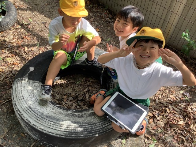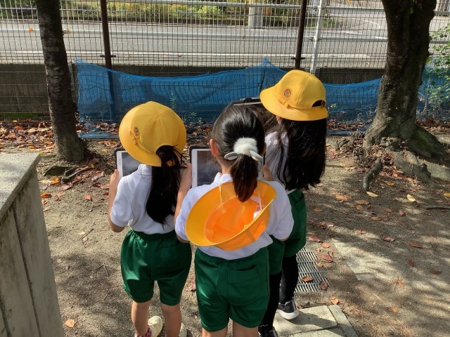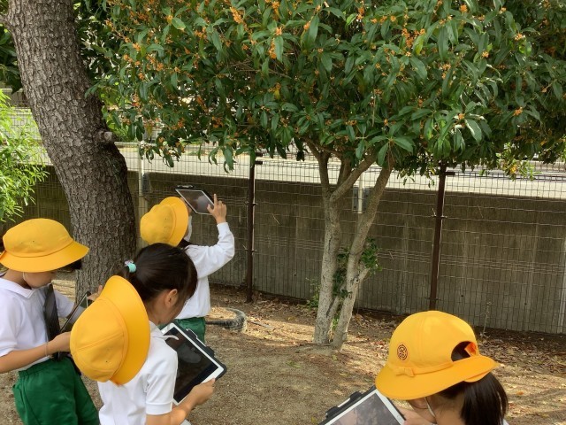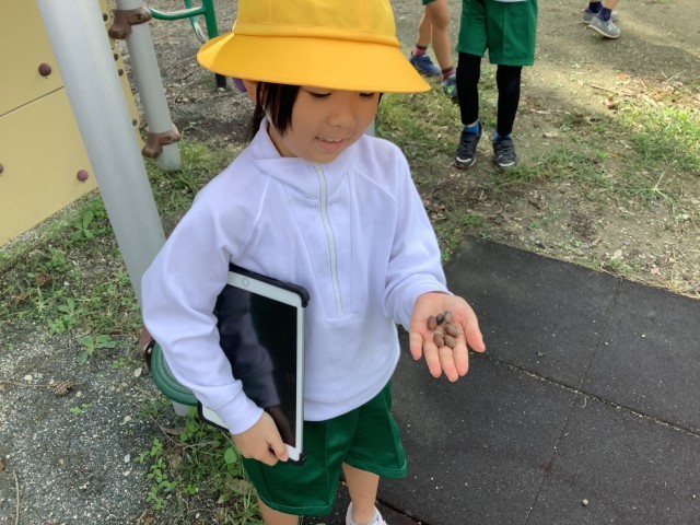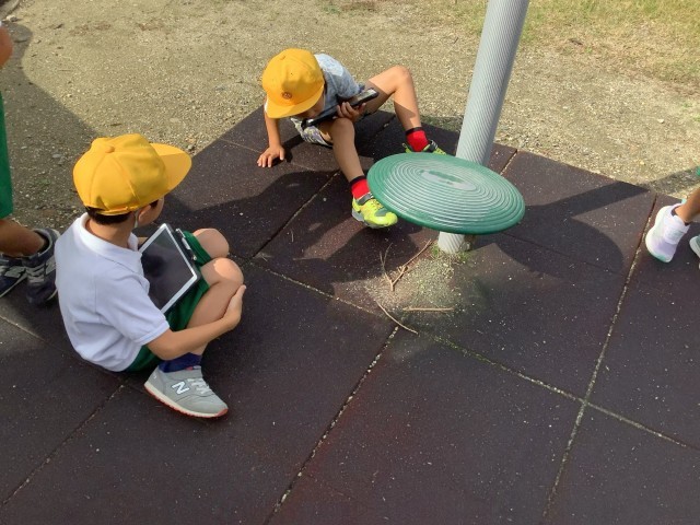 今日の授業では、みんなに紹介したいものを探しに行きました。花や生き物、植物などいろいろなものを見つけ、どれにしようか悩んでいました。