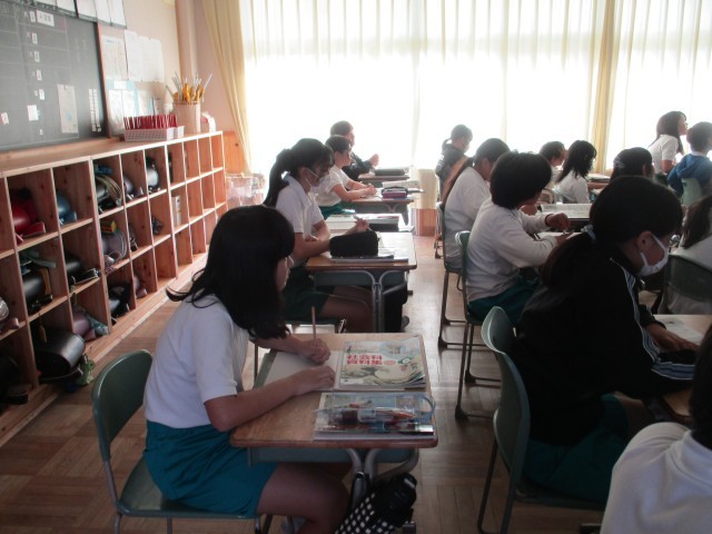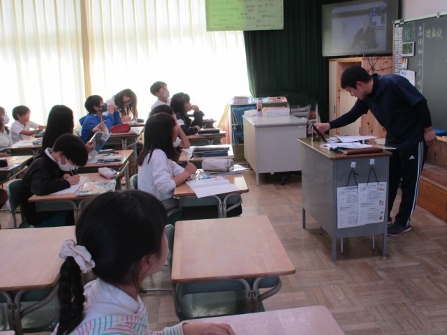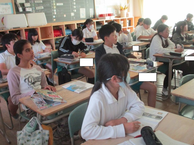 6年4組では、浮世絵の学習をしていました。浮世絵の美しさを動画を見せながら教師が語っていました。子どもたちも画面を真剣に見ていました。