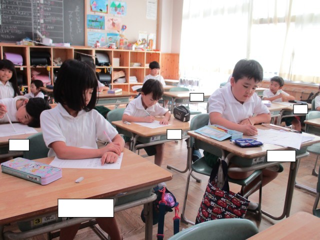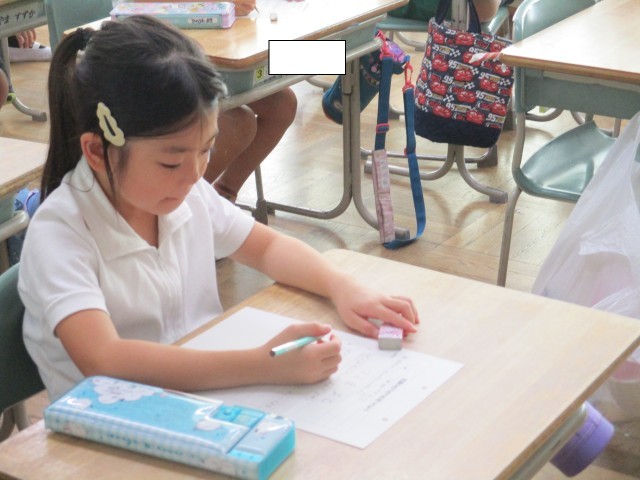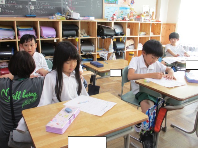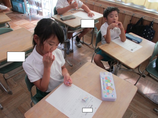 2年1組では、町探検のために、まちのすてきなところをカードに書き出していました。まちにあるものを思い出しながら一生懸命書いていました。
