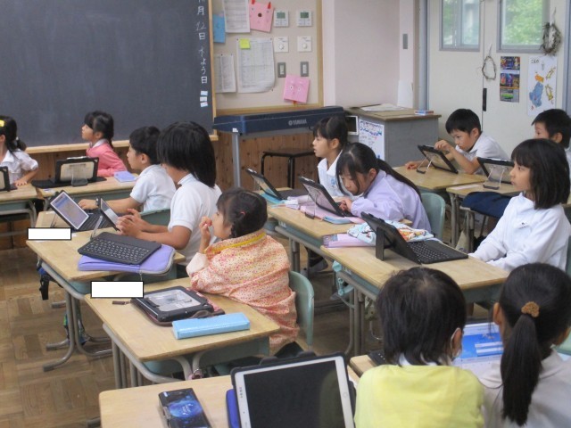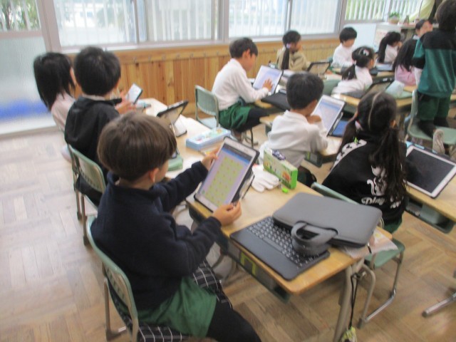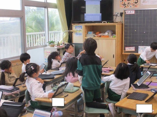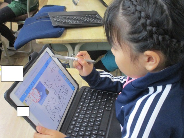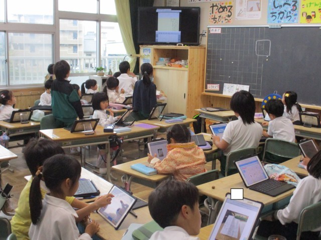 1年2組では、タブレットを使って絵日記を書いていました。最後に、教師から配られたワークシートに運動会の練習で一番頑張っていることをそれぞれ打ち込んでいました。