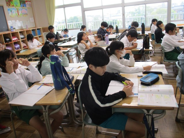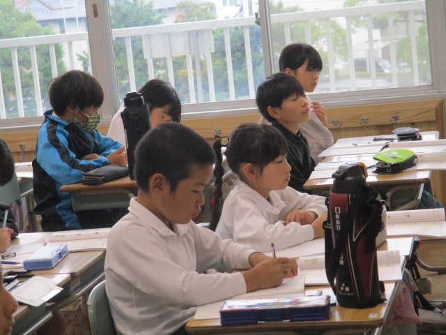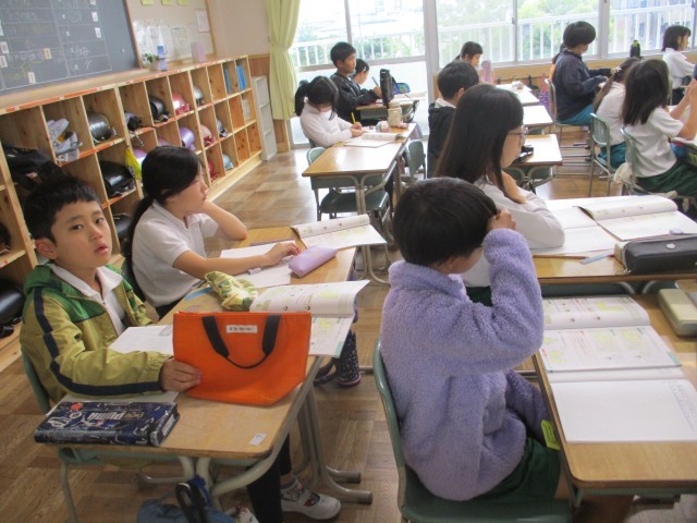 4年2組では、長方形の一部分が欠けた形の面積の出し方を考えていました。3つの出し方が考えられ、それぞれどんな計算になるかノートに書きながら解いていました。
