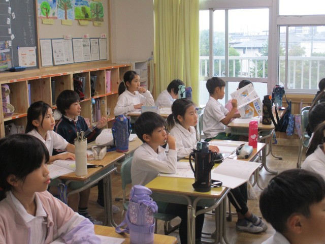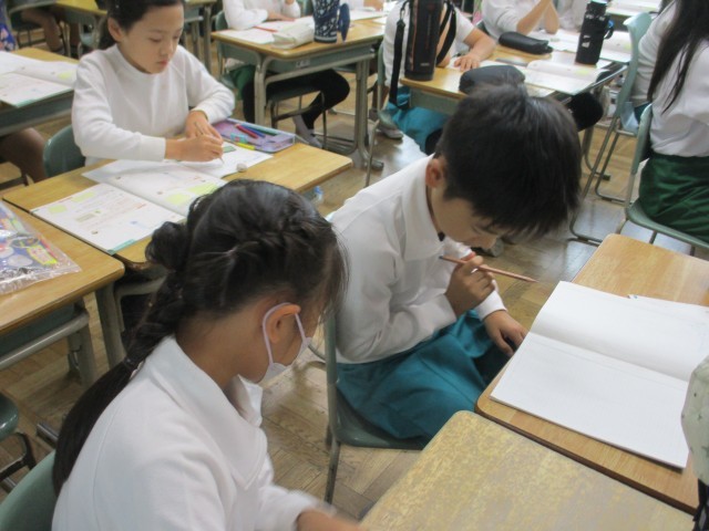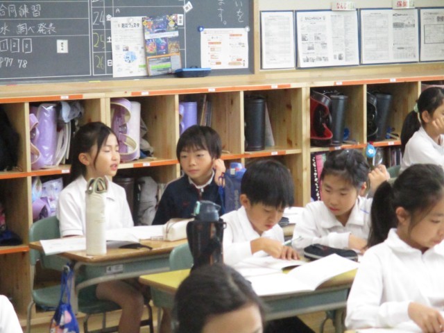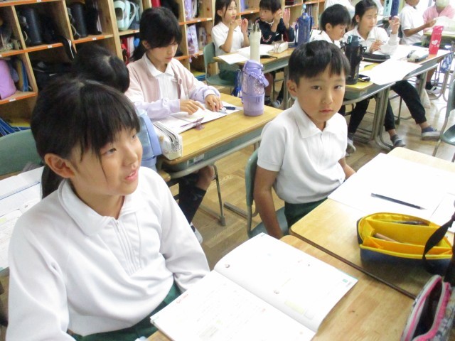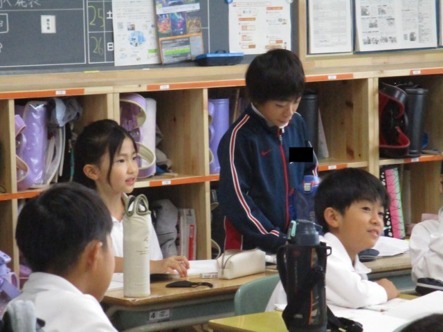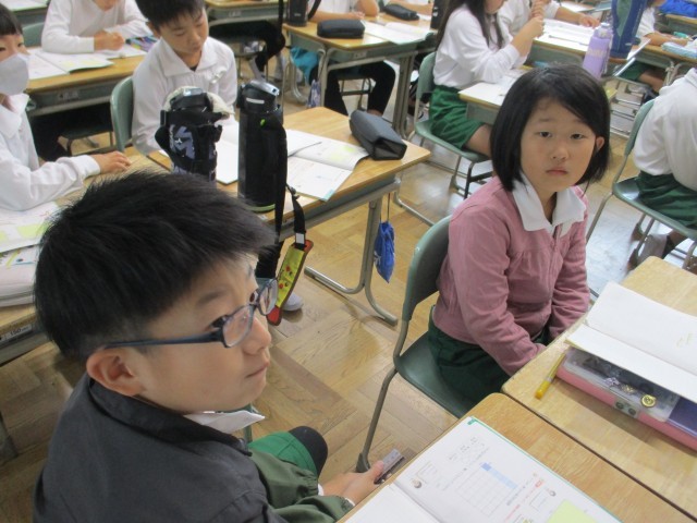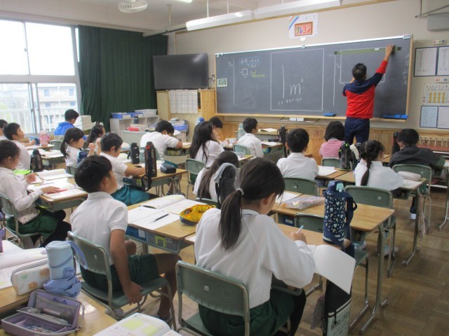 4年1組では、1平方メートルの大きさが大きく黒板に書かれていました。そして、縦5メートル横7メートルの面積の出し方を考えました。まず自分で考え、次に隣の子と意見を伝え合い、最後クラスで確認していました。