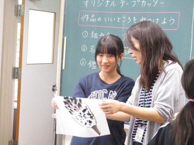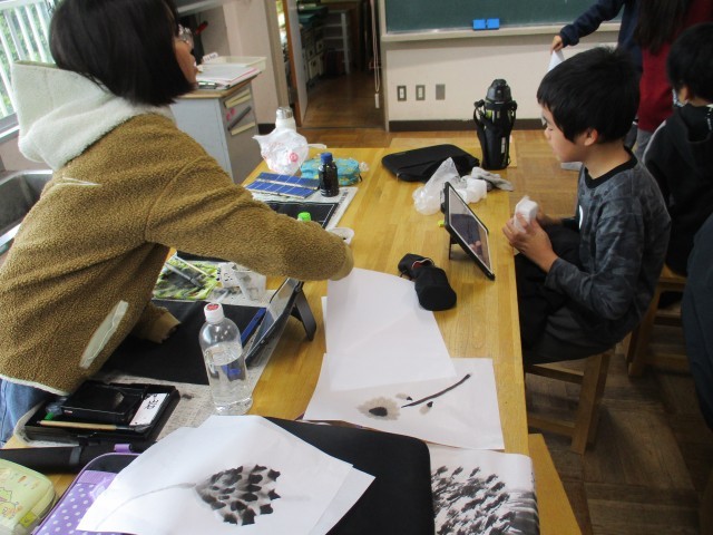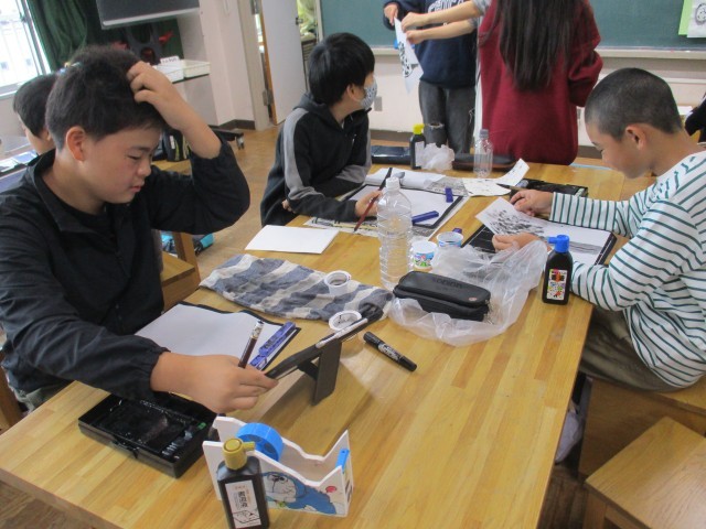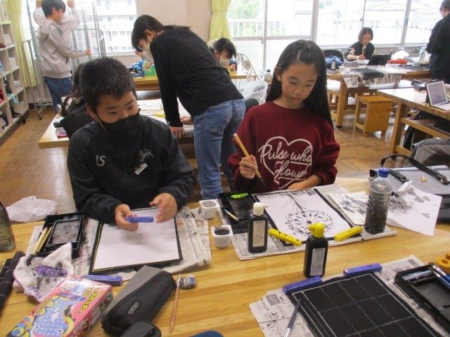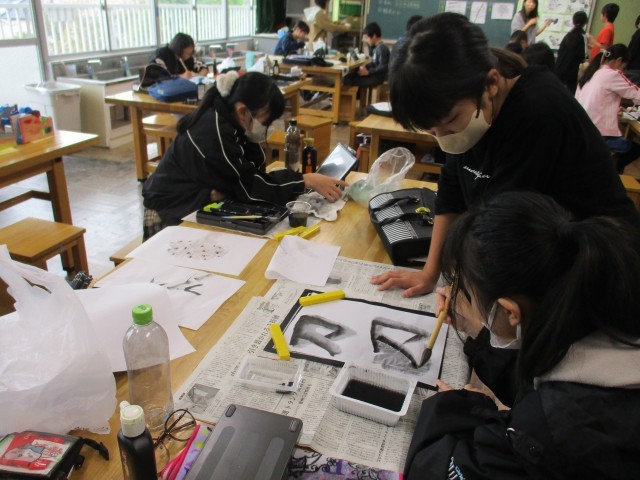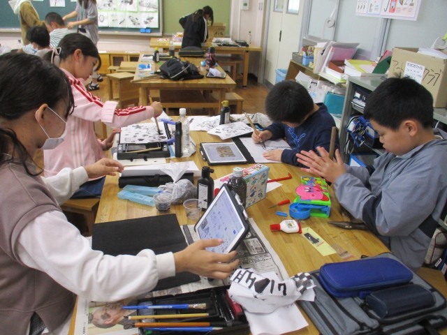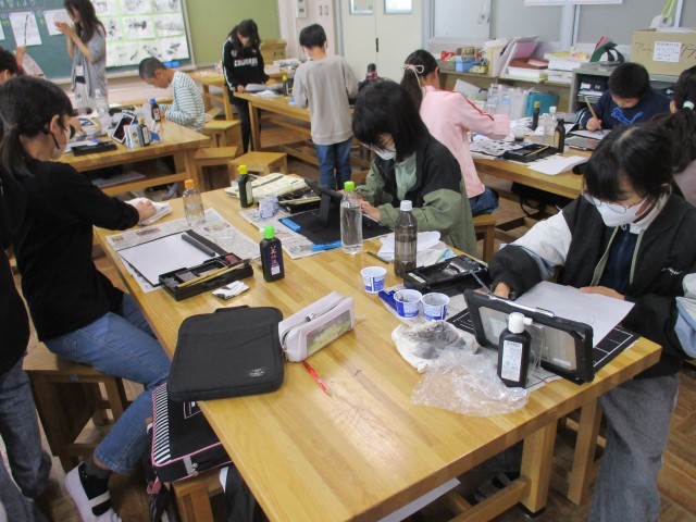 6年2組が図工室で、オリジナルテープカッターを作ったり水墨画を描いたりしていました。水墨画では、墨液を水で薄めながら上手に濃淡をつけ絵を描いていました。