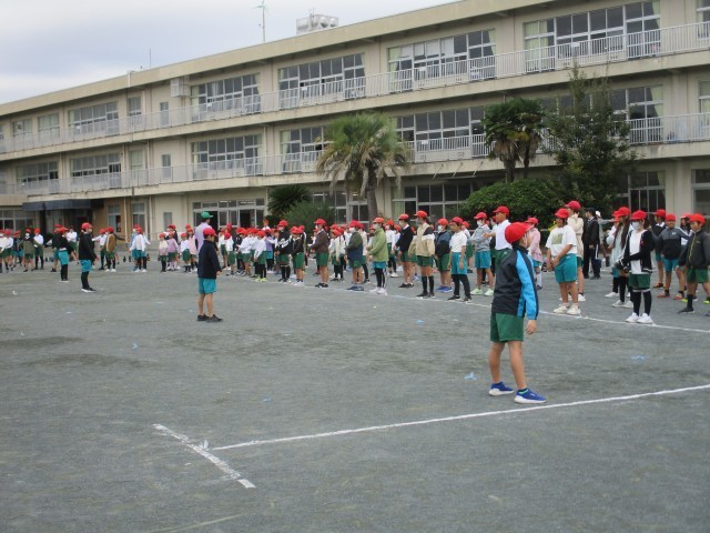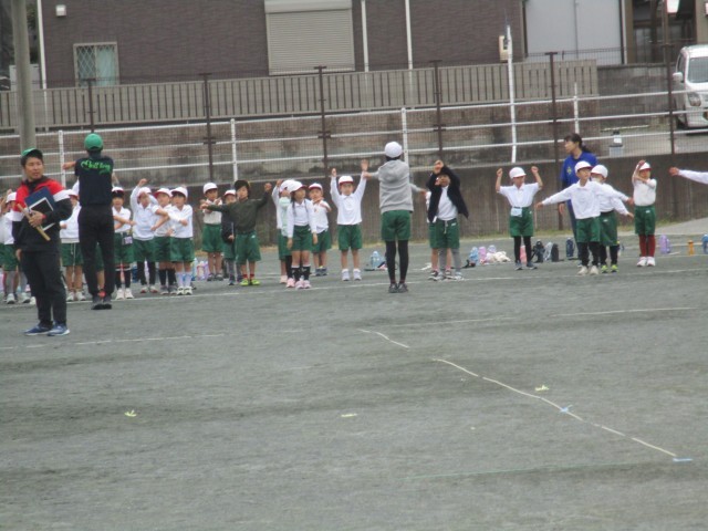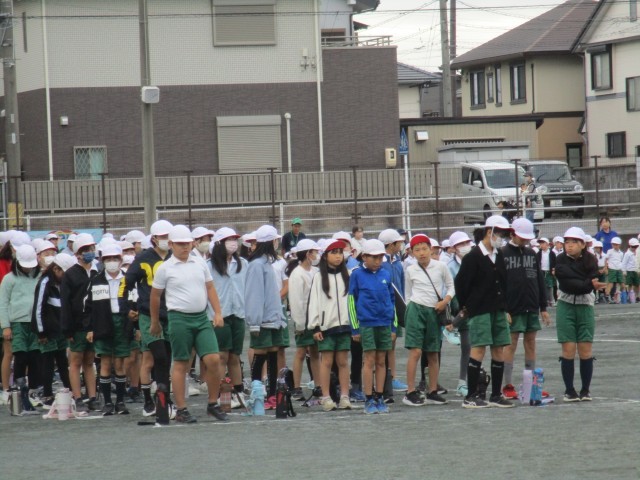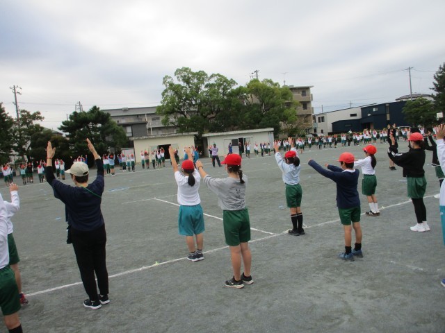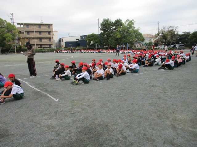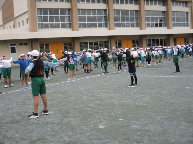 全校練習が行われました。はじめに、教師の説明を聞きました。みんなしっかり顔を向けて話を聞いていました。そのあとラジオ体操を行いました。初めてでしたが、きびきび動くことができました。
