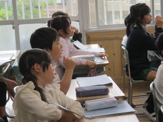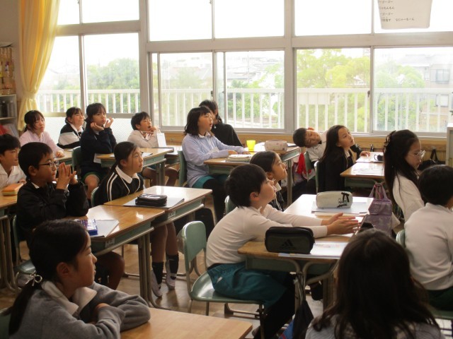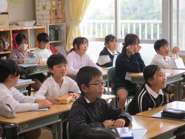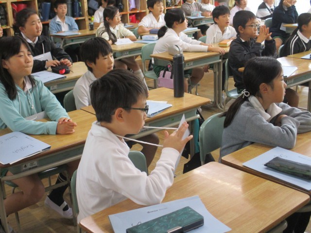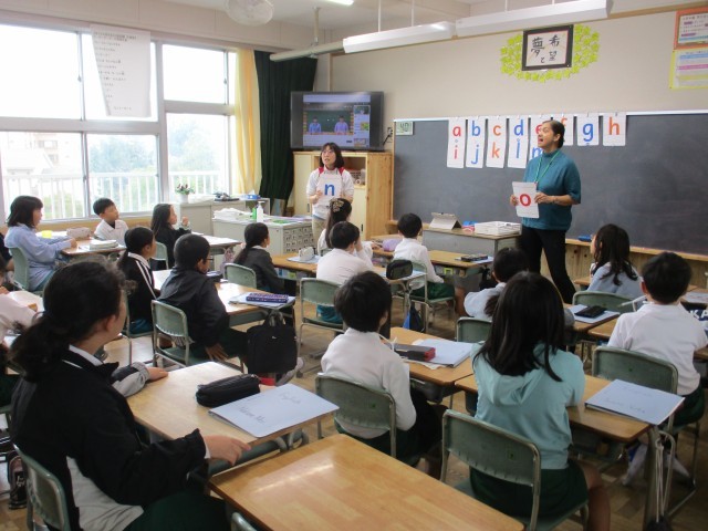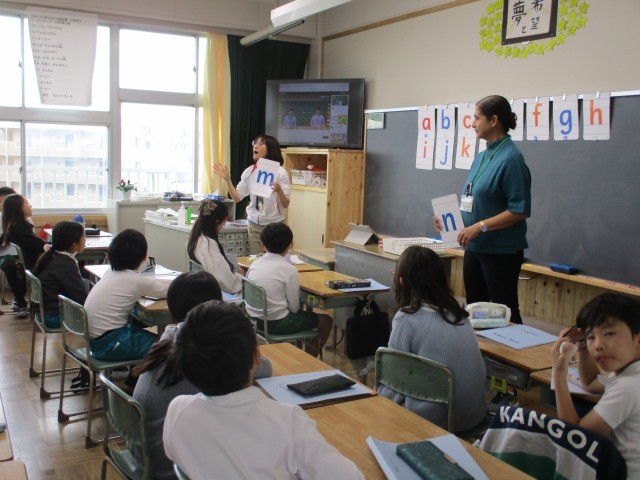 4年4組では、外国語活動の授業が行われていました。アルファベットの発音をALTや教師の口を見ながら練習していました。「n」「m」の音をこつを押さえながら口にしていました。
