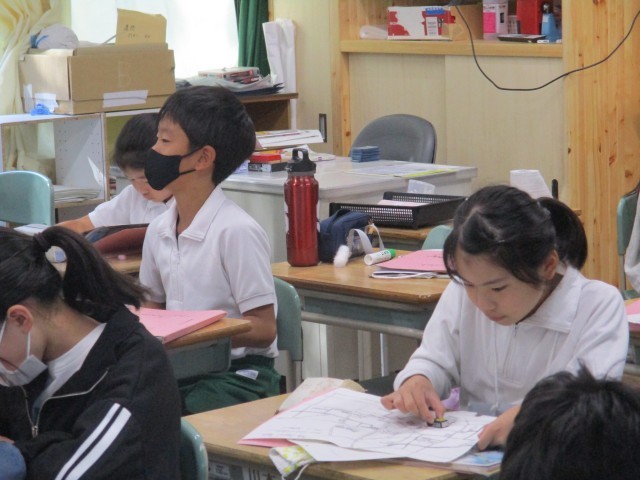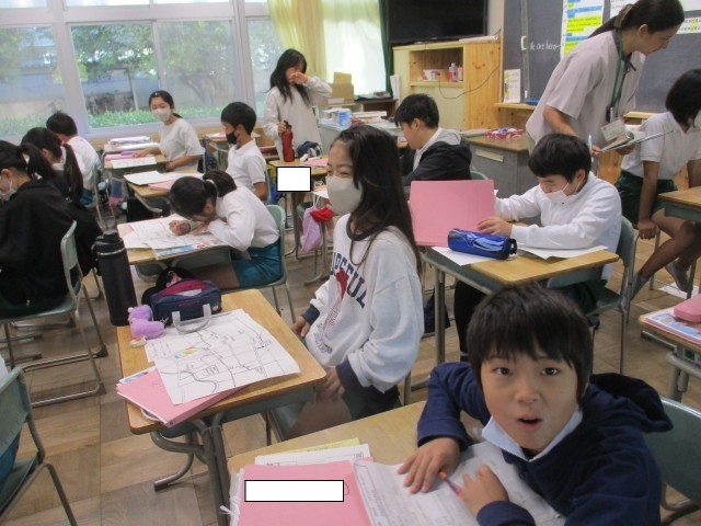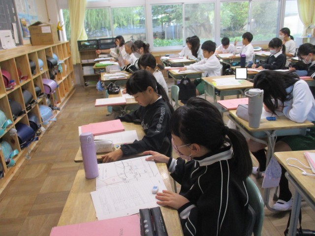 5年3組では、英語で道案内をするパフォーマンステストをしていました。二人組で教師とALTに英語での会話を聞いてもらいました。他の子は、単元の振り返りをしていました。