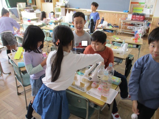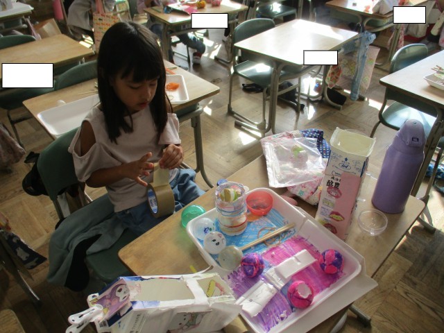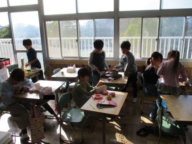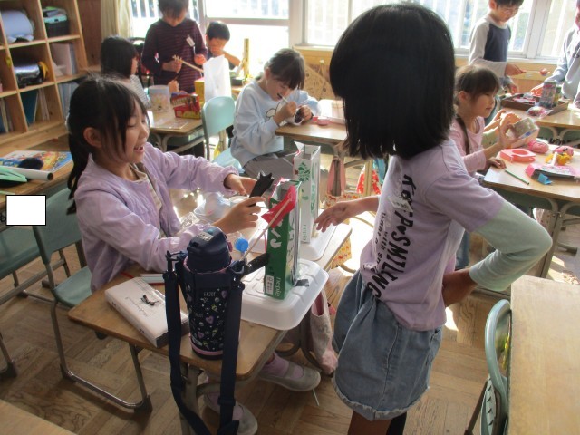 2年3組では、今日行われる「おもちゃまつり」の準備をしていました。1年生を招待して、自分たちの作ったおもちゃで遊ばせてあげるので、みんな張り切って準備を進めていました。