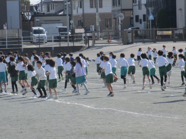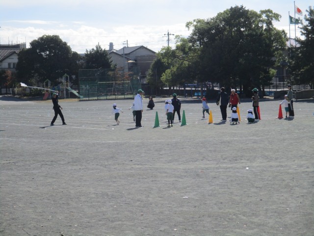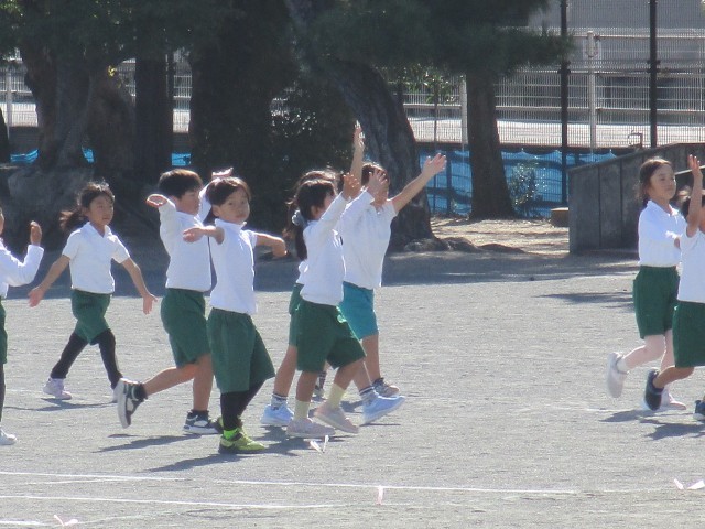1,2年生が運動場で運動会の練習をしていました。昨日の予行演習では実際に行わなかった徒競走をしたり、踊りで移動を確認したりして本番に向けて頑張っていました。