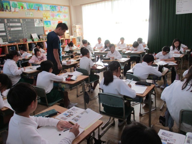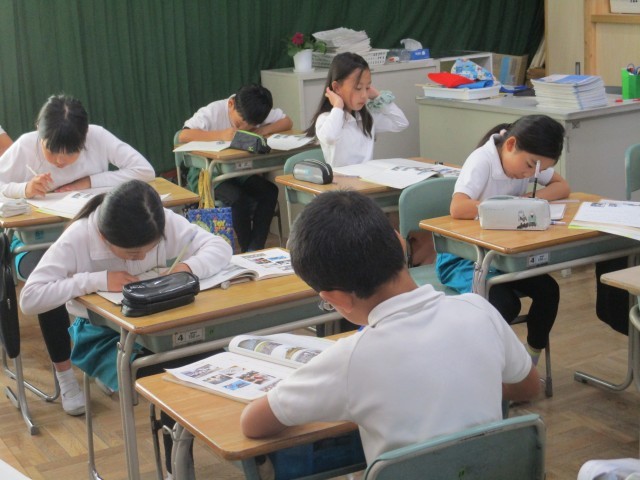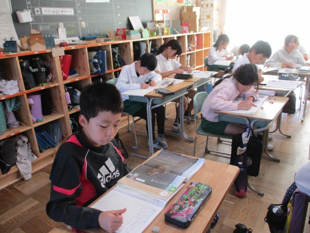 4年4組では、「いのちをつなぐ岬」の話を読んで、自然を守るために大切な心について話し合いをしていました。最後、自分でできることを考えてノートに書いていました。