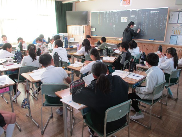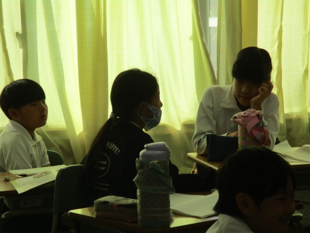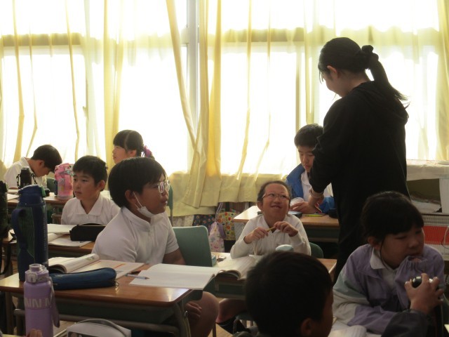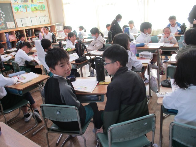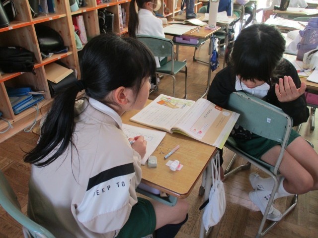 4年1組では、「つまらなかった」の学習をしていました。すれ違う二人の主人公の立場や気持ちを考えながら、二人にとって足りなかったものは何かを近くの席の子と話し合っていました。