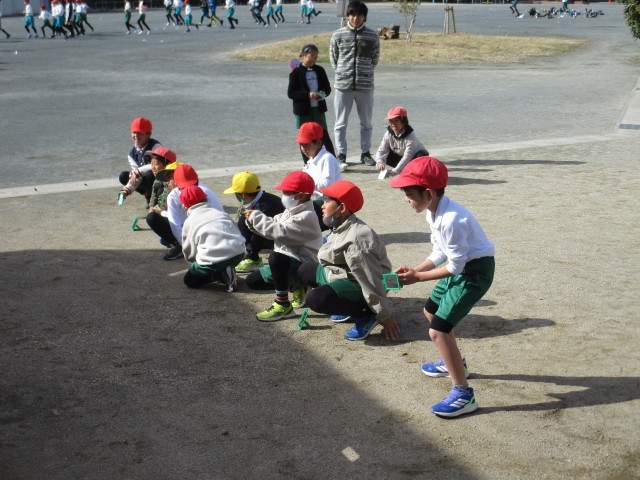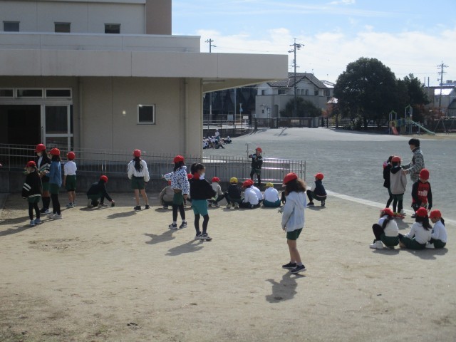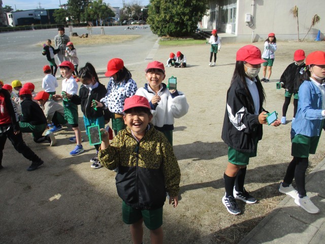 3年3組が運動場で光の学習をしていました。鏡で日光を反射させて特徴を調べていました。みんな楽しそうに実験をしていました。