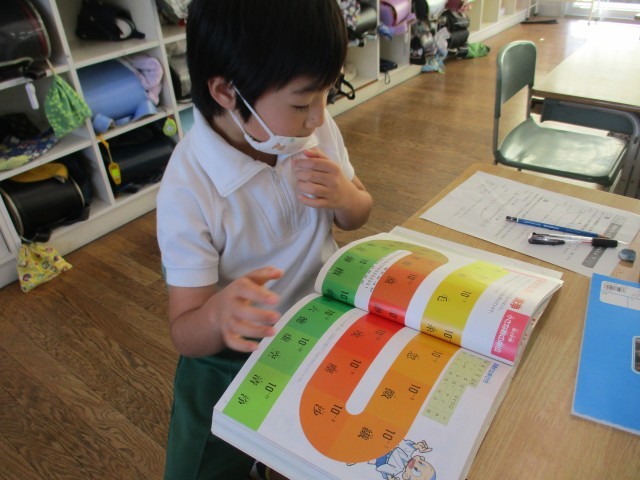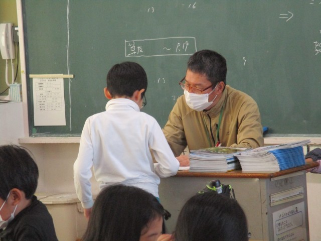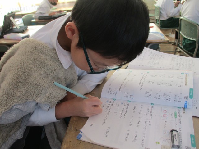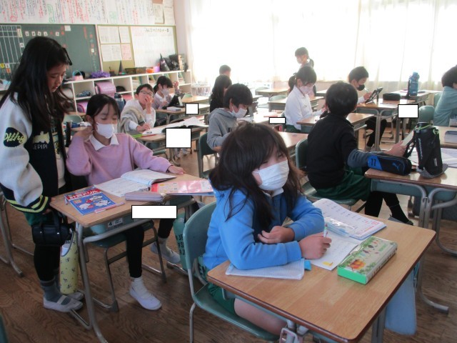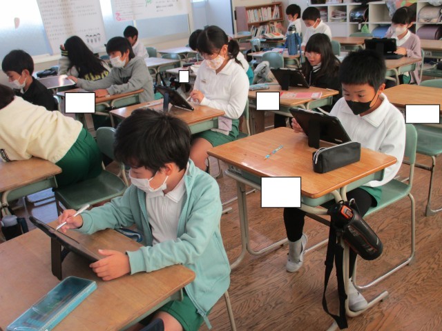 3年1組では、2桁×1桁のかけ算の筆算の問題を解いていました。できた子から教師に見せて○付けをしてもらいました。終わった子は、タブレットで計算問題を解いたり、数にまつわる本を読んだりしていました。