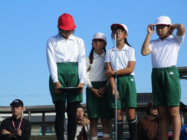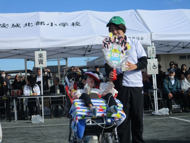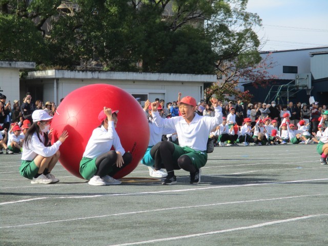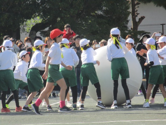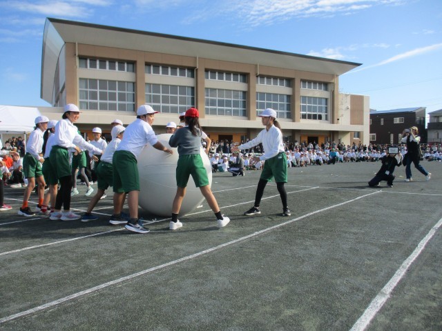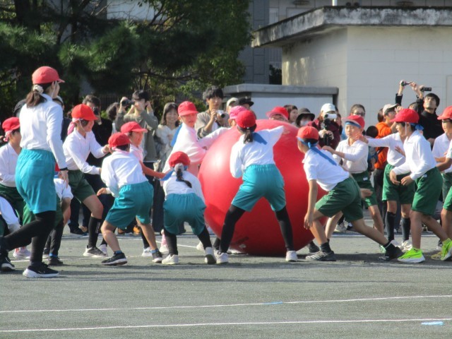 団ごとに大玉を転がして速さを競いました。2回戦とも僅差で、大いに盛り上がりました。