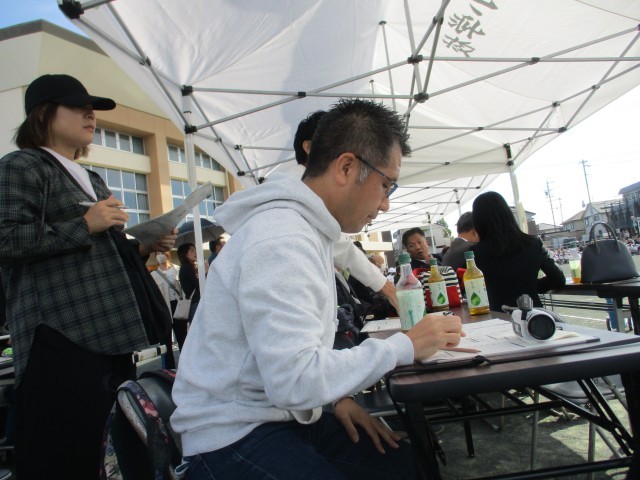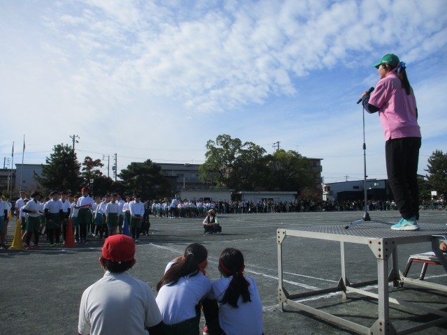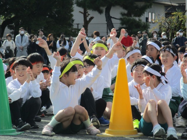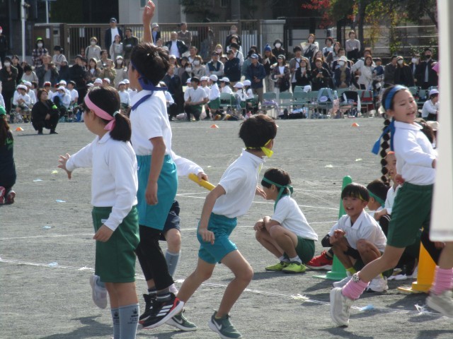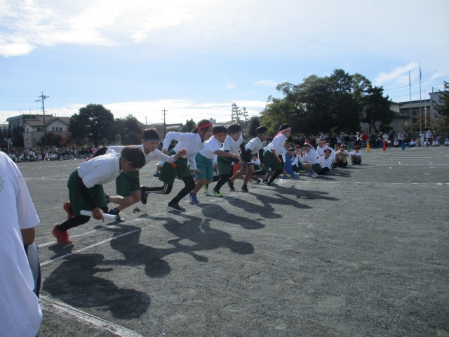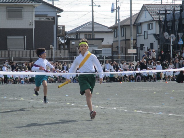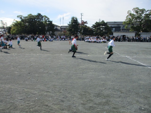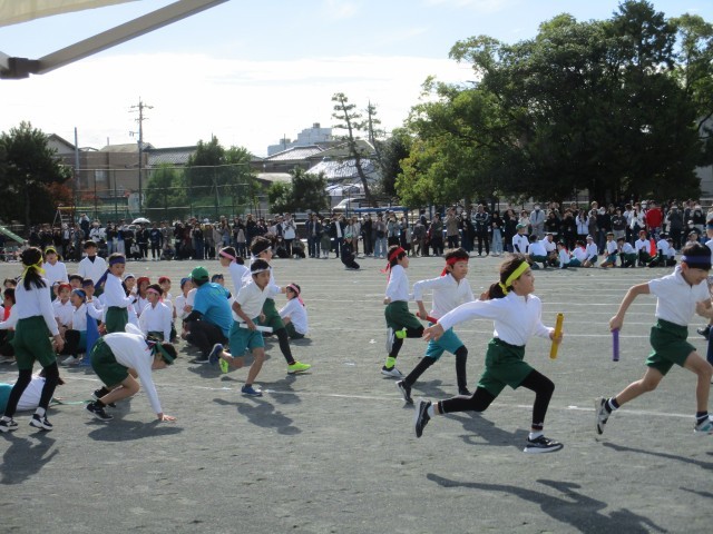 4年生の学級対抗リレーです。声を掛け合いながら必死にバトンをつないでいました。白熱するレースでした。テントに結果が届き、PTA役さんが一生懸命得点を集計してくださっています。