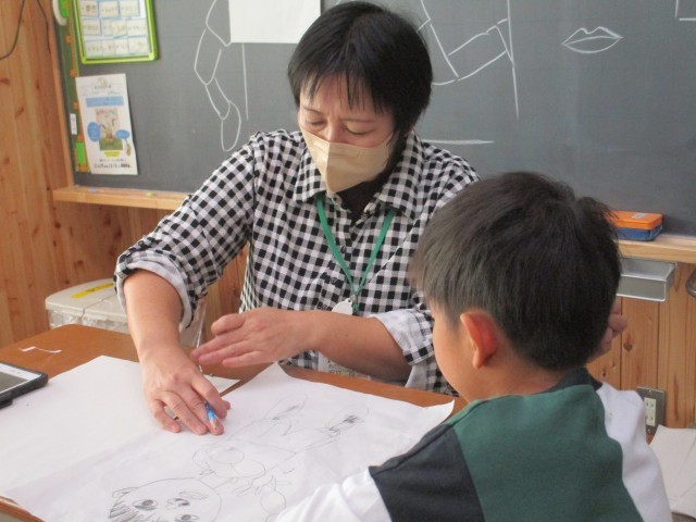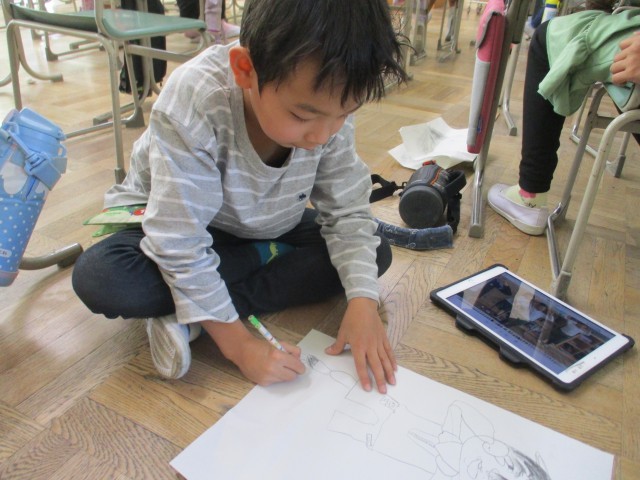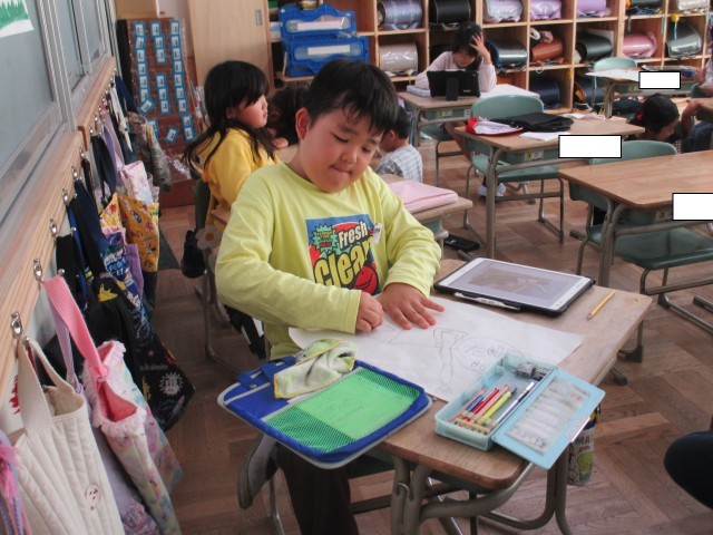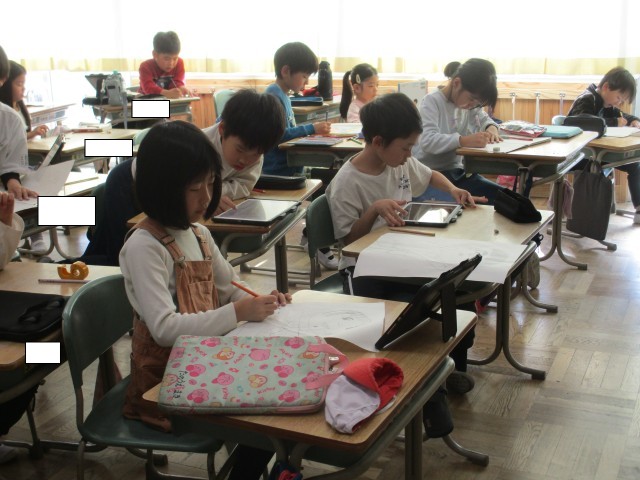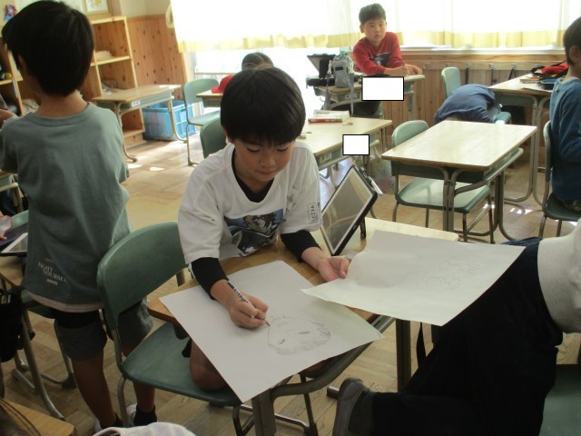 2年1組では、紙版画の下絵を描いていました。タブレットに写った自分の姿を見ながら大きく画用紙に描いていました。