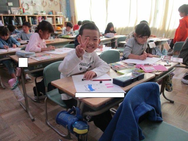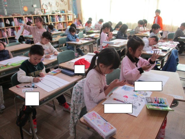 1年3組では、運動会の絵を描いていました。色とりどりのクレヨンを使って自分が頑張った様子を生き生きと描いていました。