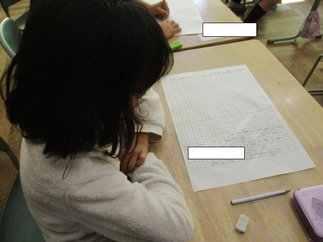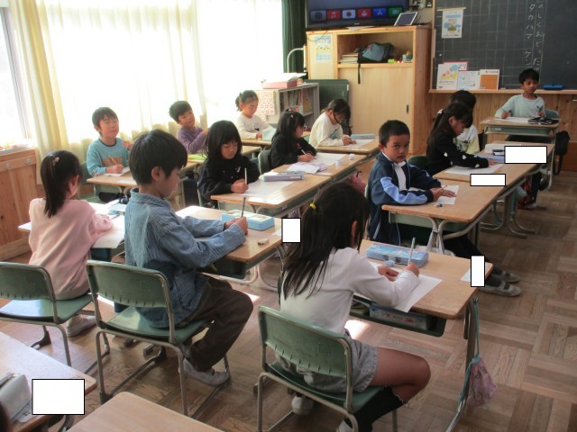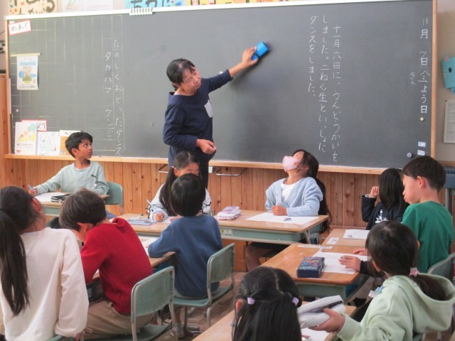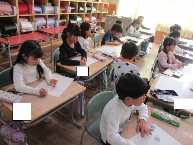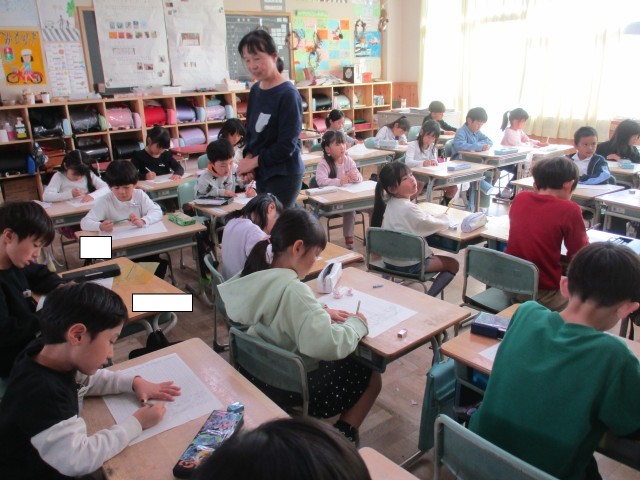 1年2組では、運動会の作文を書いていました。段落を付けながら、どんなことを書きたいか教師と対話しながら進めていました。