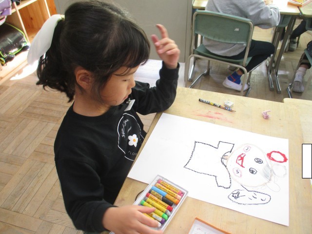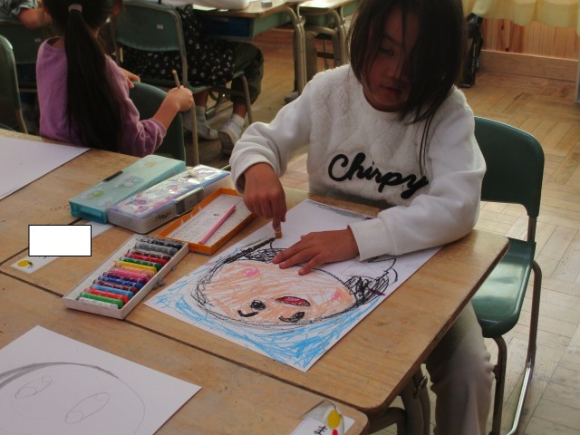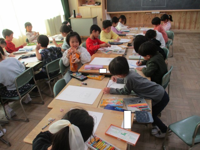1年1組では、運動会の絵を描いていました。自分を大きく描いた後、周りの友達や風景を付け加えていました。