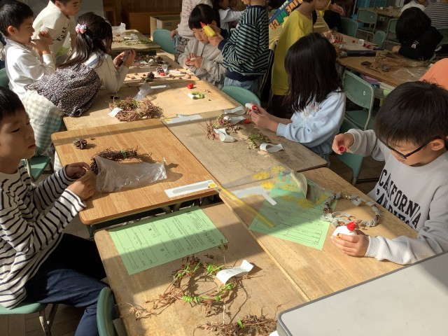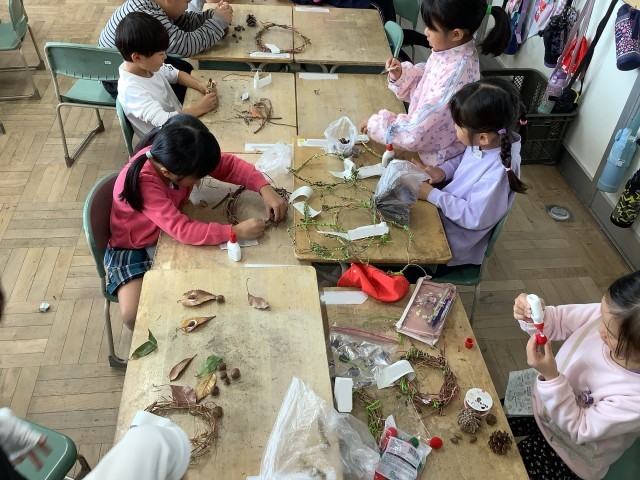 今日の生活科では、アサガオのリースの仕上げを行いました。それぞれが秋のものなどをつけて、オリジナルのリースにしていました。