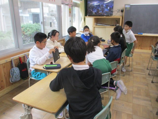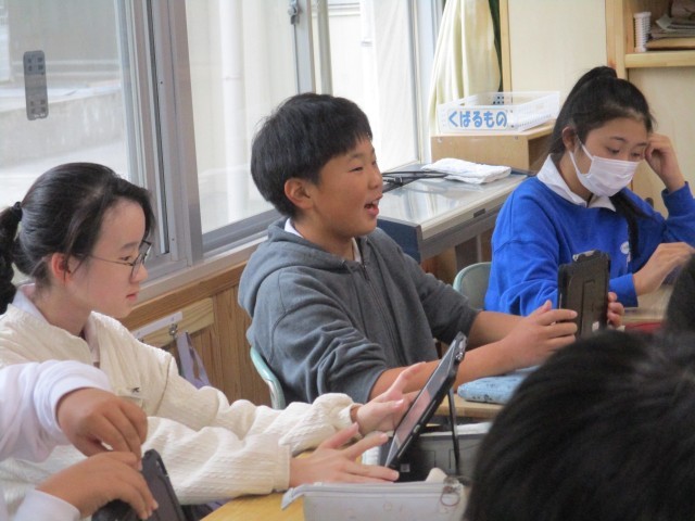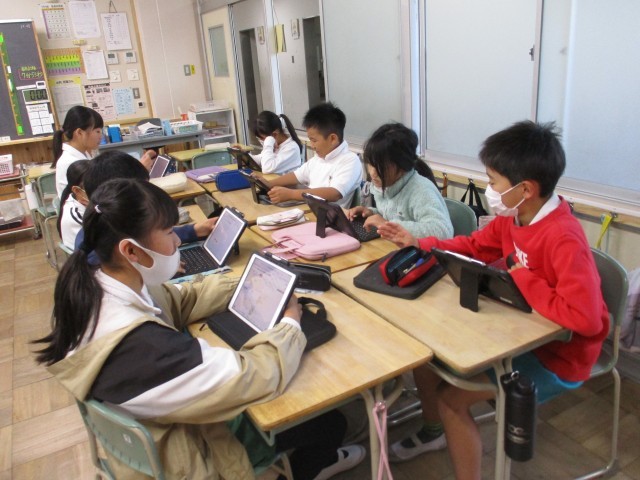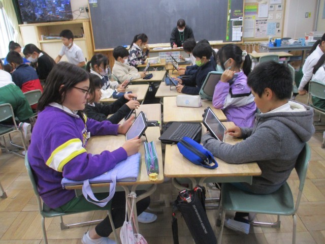 5年4組では、園児との交流の計画を確認していました。タブレットを使ってどんなことをすると園児が喜んでくれるか考えて打ち込んでいました。